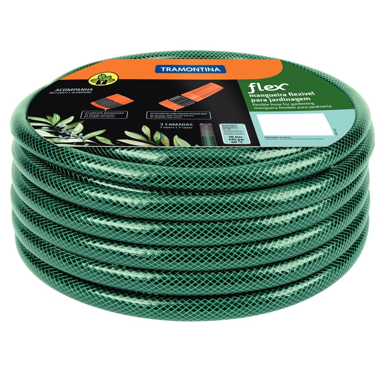 Mangueira flex verde pvc 3 camadas 20m engate rosqueado e esguicho tramontina